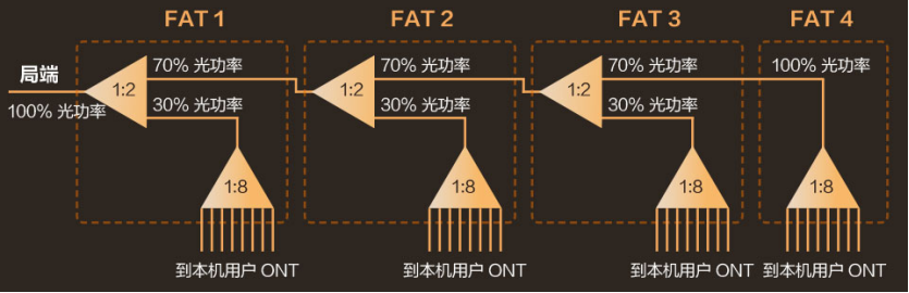 通常,將多個(gè)這種不等比分光器進(jìn)行“級(jí)聯(lián)”,如4級(jí)“級(jí)聯(lián)”(如圖2),前三個(gè)都是不等比例分光,第四個(gè)分光器是等比例分光,即局端來(lái)的光功率100%留給了FAT4本機(jī)用戶。雖然第三個(gè)、第四個(gè)分光器的局端光功率絕對(duì)值相對(duì)較小,但是,也仍然能夠滿足其本機(jī)用戶的需要。