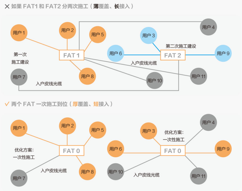 當(dāng)FAT1首先裝滿,沒(méi)有空閑端口了,在FAT1周邊的新用戶(如用戶7)無(wú)奈需要連接到FAT2。同樣,入戶安裝距離太長(zhǎng),大大增加了入戶裝機(jī)成本。
