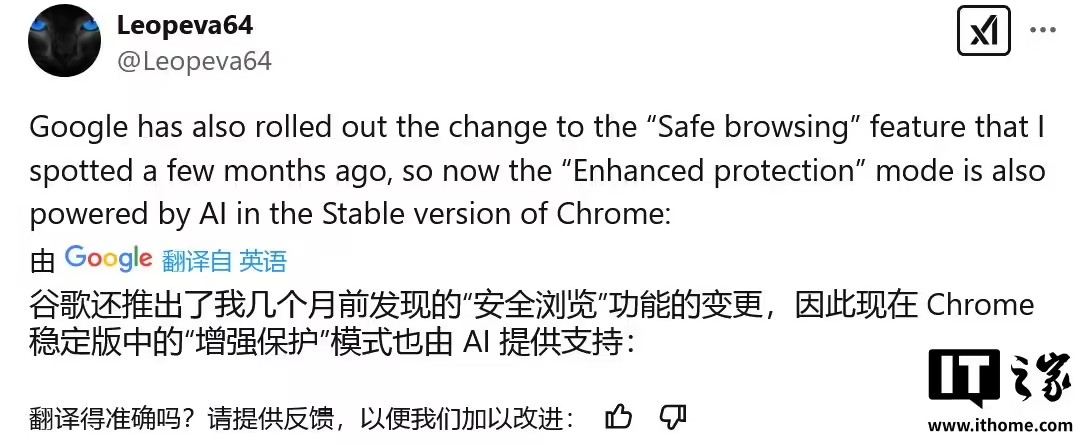 IT之家 2 月 17 日消息,消息源 @Leopeva64 昨日(2 月 16 日)在 X 平臺發(fā)布推文,稱在經(jīng)過 3 個月的 Canary 頻道測試后,谷歌 Chrome 瀏覽器穩(wěn)定版已全平臺上線全新“增強(qiáng)保護(hù)”(Enhanced protection)功能,在現(xiàn)有功能基礎(chǔ)上,通過 AI 實時防護(hù)危險網(wǎng)站、下載和擴(kuò)展程序等。